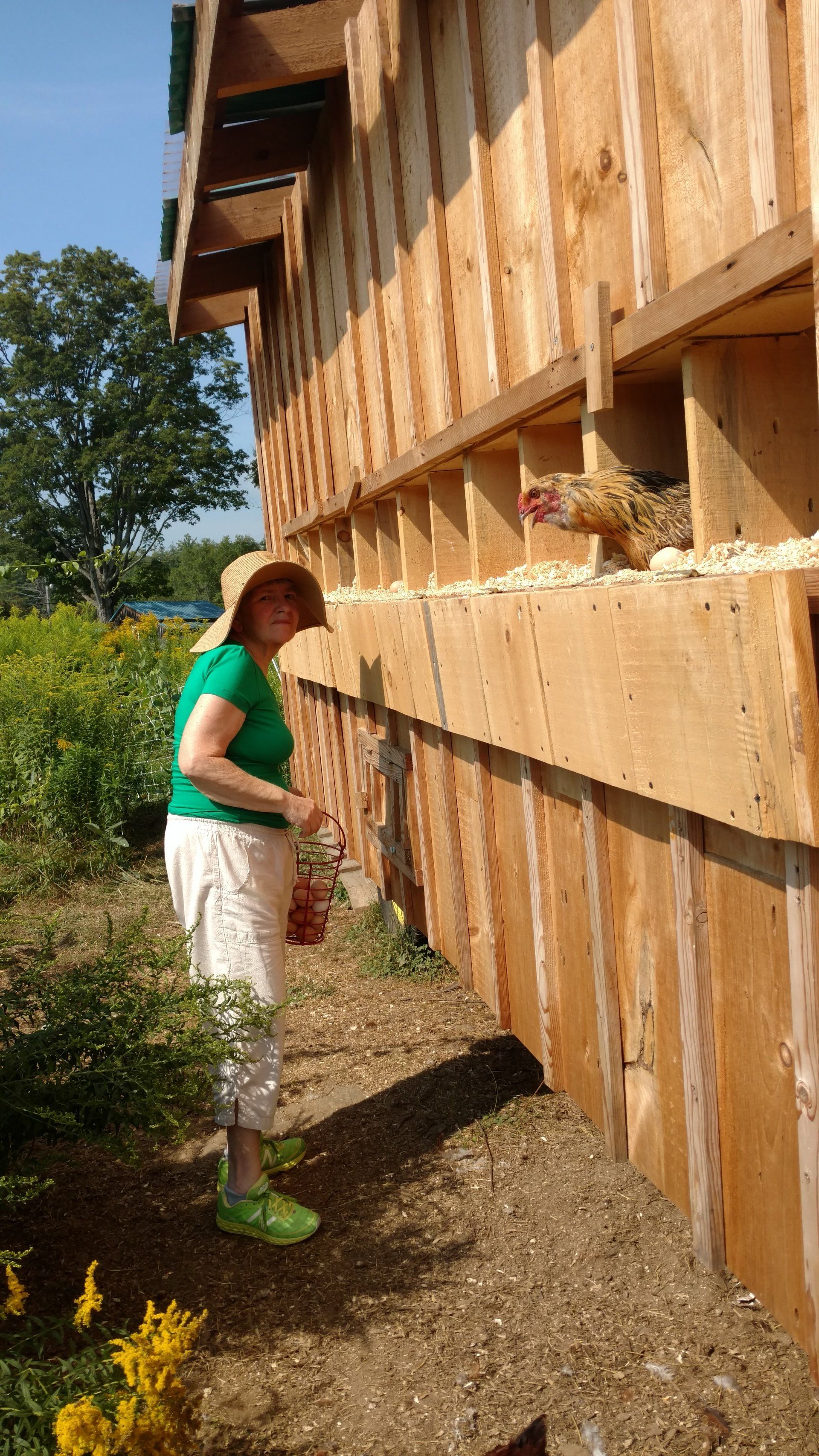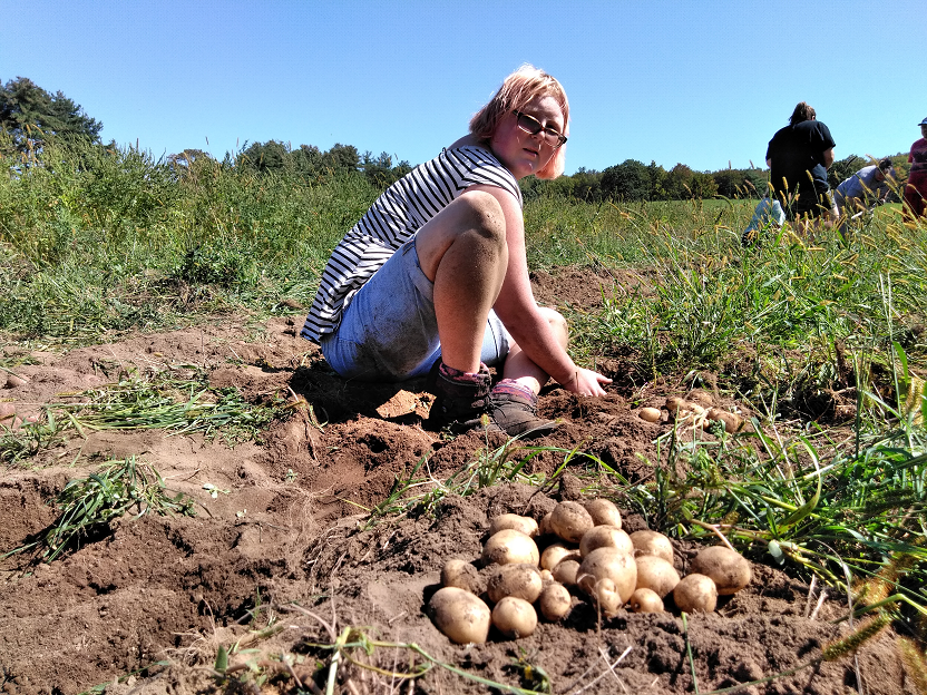 she works on the farm tending to the animals and helping with the gardens by weeding, planting and watering.